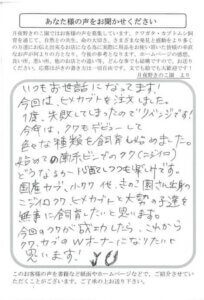 今年になり息子(4歳)にせがまれ苦手なカブト虫を知人から譲り受けました。1年しか生きられないので、ちゃんとした環境で飼育しようと思い色々調べていくうちに貴社を見つけました。今では幼虫が30匹くらいいます。虫が苦手なので…。本当は見たくないのですが息子と一緒に世話をしています。きのこマットを幼虫がムシャムシャ食べているのを見るとほんの少しカワイく思えるようになりました。