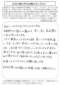 ミヤマクワガタを飼育しており、昆虫マットと餌(ゼリー)を定期的に購入しています。発送も早く、梱包も丁寧で助かっています。またHPでも様々な情報を発信されているので、いつも楽しく拝見しています!以前は東京に住んでおり、虫はとても苦手で、恐怖でしかありませんでしたが、4年前の群馬への移住を機に身近な存在となり、今では毎日の虫との出会いが楽しみです。近くの林でクワガタが採れることを知り、毎年数を決めて大事に採取し、育てています。虫が好きになってから、それまであまり興味のなかった地球環境も学ぶようになりました。都会では虫と出会う機会はゴキブリくらいしか無いかもしれませんが、もっと触れ合う機会が多くあれば虫たちの「人間っぽさ」「ドジぶり」なども知り、今日を精一杯生きている彼らを愛おしく思う気持ちが生まれる気がします。御社の経営理念は素晴らしいと思います。これからも応援しています!