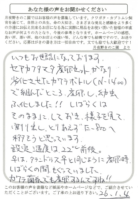 いつもお世話になっております。セアカフタマタ産卵セットかなり劣化させたカワラボトル(N-1400)で組んだところ、産卵し幼虫がふ化しました!!しばらくは、そのままにしておき様子を見て割り出し、とりあえずE-800へ移そうと思います。設定温度は22℃前後。♀はタランドゥス♀と同じように産卵時、カワラ菌糸でも産卵するんですね!!