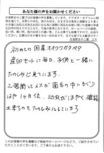 国産オオクワ専用の菌糸ビンがあったらおもしろいと思います。E-8001本目で34gができました。ありがとうございます。