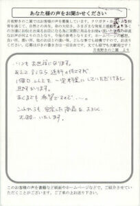 先日、月夜野きのこ園様のHPのプレゼントに応募した際に、クワガタの飼育についての質問したら、すぐにメールで回答いただいたのがすごくうれしかったです。