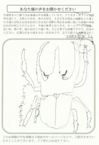 ハロウィンキャンペーンでオオクワ幼虫を購入しました。判別の結果♂2ひき♀3ひきの様でした。大事に育て来年の羽化を目指してたのしみです。また、楽しみなキャンペーンなど企画を宜しくお願いします。