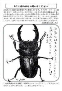 友人からオオクワガタをもらい、初めての産卵に成功しました。ネットでいろいろ調べましたが、月夜野きのこ園さんのものが1番安心出来そうで、実績が多く初めてなので、信頼出来そうと思い、購入しました。現在7つ購入中5匹は食べた後があり元気です。残り2匹も元気だといいのですが、11月に2回目のビン(3ヶ月後位がいいと書いてあった)を購入させていただく予定ですので、よろしくお願いします。