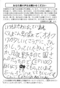 今回、菌床ブロックをいただきました。家で飼っている幼虫をこれに入れて、大きく育てていきたいと思いました。とても、うれしいです。ありがとうございました。