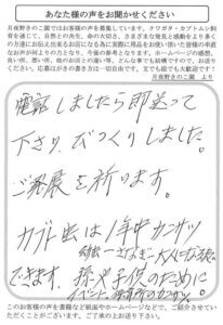菌糸ビンが配達予定日より何日も早く届いてとても助かりました!!今、努めている職場の上司がカブクワ好きな方で話をしているうちに興味がわき、今現在ギラファ幼虫3匹、ダイオウペア、ニジイロペア飼育しています。今後も菌糸ビンなどを購入する予定なのでよろしくお願いします。