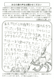 梅雨は明けていませんが、7月上旬は夏のように暑くなりましたね。体長に気をつけていきましょう。ラジオで前橋でのプロ野球放送で、日没後にも気温が3?℃だと言うのを聞いて、やはり群馬の夏は暑いですね。カブトムシの羽化&活動が6月20日過ぎから始まりにぎやかです。自分としては多い数のカブトムシの飼育になりますが、元気な姿を見て充実感はあります。今年は初めてトマトの栽培をしましたが、実が緑色のうちからアリに食べられて、赤くなってもナメクジやモニョモニョ動く虫に先を越されています。でも20%は収穫できています。有意義な夏にしたいです。