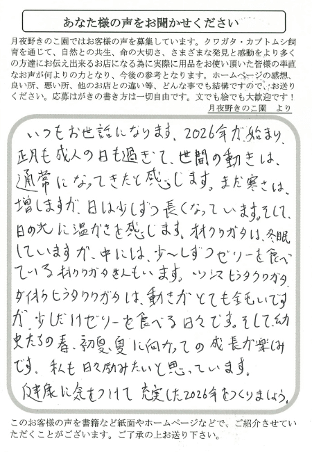 いつもお世話になります。2026年が始まり、正月も成人の日も過ぎて、世間の動きは通常になってきたと感じます。まだ寒さは増しますが、日は少しずつ長くなっています。そして日の光に温かさを感じます。オオクワガタは冬眠していますが、中には少~しずつゼリーを食べているオオクワガタさんもいます。ツシマヒラタクワガタ・ダイオウヒラタクワガタは動きがとても鈍いですが、少しだけゼリーを食べる日々です。そして幼虫たちの春、初夏、夏に向かっての成長が楽しみです。私も日々励みたいと思っています。健康に気をつけて充実した2026年をつくりましょう。