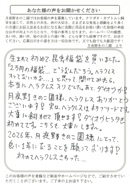 生まれて初めて、昆虫福袋を買いました。「2万円の福袋…どうなんだろう。ヘラクレス入ってないかな…」と思って、開けてみたら本当にヘラクレス入りでした。あと、ダイオウか!月夜野きのこ園様、ヘラクレスありがとうございます!実はヘラクレスは初ブリードです。大事に飼わせて頂きます!ダイオウヒラタも初めてです。こちらも大事にします。2026年、月夜野きのこ園様にとって、良い1年になることを願っております!初めてヘラクレスさわった…