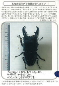 購入させて頂いたオオクワガタ、やっと初のオスが羽化しました。最初の4頭が全てメスで大変残念だっただけに今回2頭の内、1頭がオスで大変うれしく毎日のぞいています。本当にありがとうございます。今度はヒラタ系を、と思っています。(グラントシロカブトも元気に育っています。)