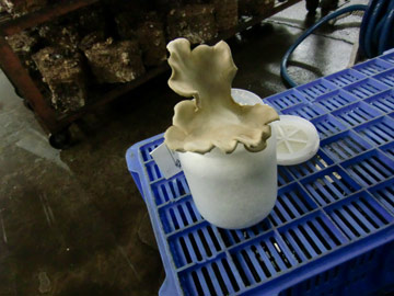 月夜野きのこ園の菌糸ビン、菌糸ブロックにはオオヒラ茸系の種菌が