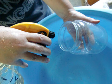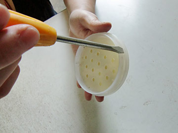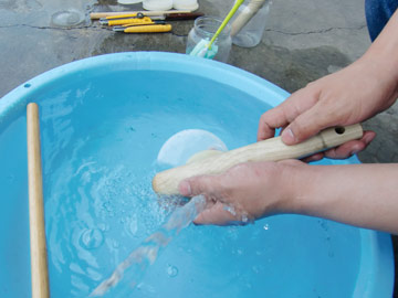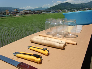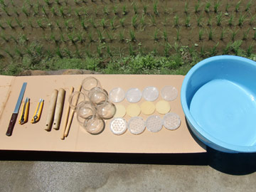 タライ、詰め替え用容器、 穴あけ棒、スリコギ棒、