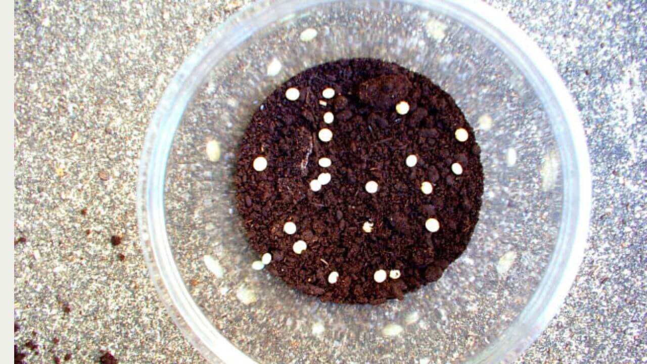 プリンカップに硬めに発酵マットを詰め、鉛筆などの棒(1cm弱)で穴を数箇所開けます。深さは1~2cm程度 弊社の場合、使用するマットは産卵セットに使用したマットを使っています。