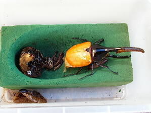 通常、何事もなければ成虫が出てくるまで何もしなくても良いのですが、ヘラクレスなどはケースの隅に蛹室を作ってしまい蛹化するときに角が曲がってしまう事があります。それを防ぐ為に前蛹(ぜんよう)という状態になるタイミングを見逃さず観察します。前蛹の段階で人工蛹室に移すかそのまま蛹化・羽化させるかを判断します。