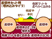 シイタケの原木栽培で使用したホダ木をカットした通称「産卵木」(さんらんぎ・さんらんぼく)を使用した産卵方法です。産卵木に加水して発酵マットと組み合わせてセットします。