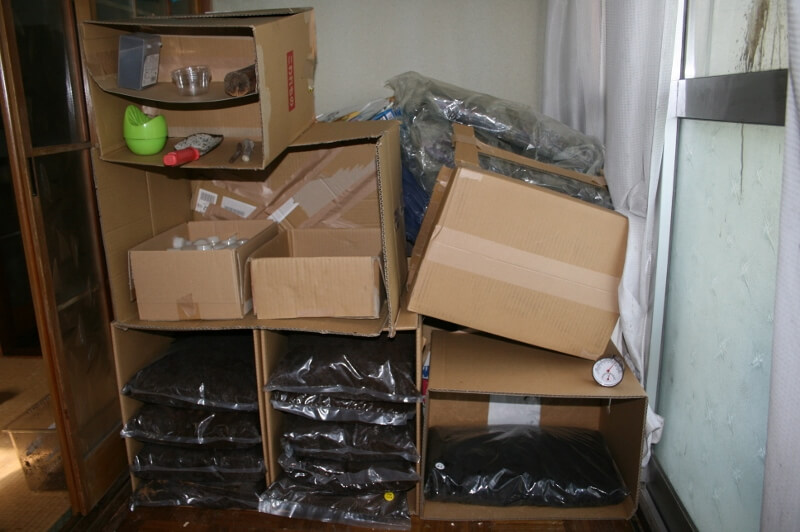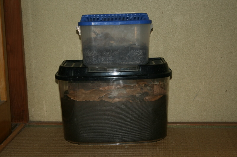 僕は小学5年生で、カブトムシを4年前から飼育しています。今年からクワガタ飼育にも挑戦しています。僕は小学生なので飼育スペースも小さく、そこで飼える分だけ飼育しています。飼育部屋は、普段使わないお客様用の部屋の床の間(91×80×235)を使っています。また、飼育部屋の隣の部屋にはカブ・クワ用のマット置き場もあります。飼育部屋とマット置き場を離すことで飼育部屋からマット部屋へのコバエの侵入をできる限り減らせるようにしました。そして高温に弱いミヤマクワガタは風通しが良い涼しい寝室に置いています。このミヤマクワガタはWD個体です。