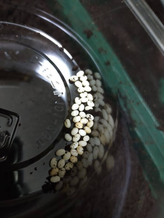 ♀が自分で土かを固めて産ませる習性を利用しました。固めた方が産むと言う方もいますが、♀に負荷がかかってしまうと思い、この方法で産卵させました。