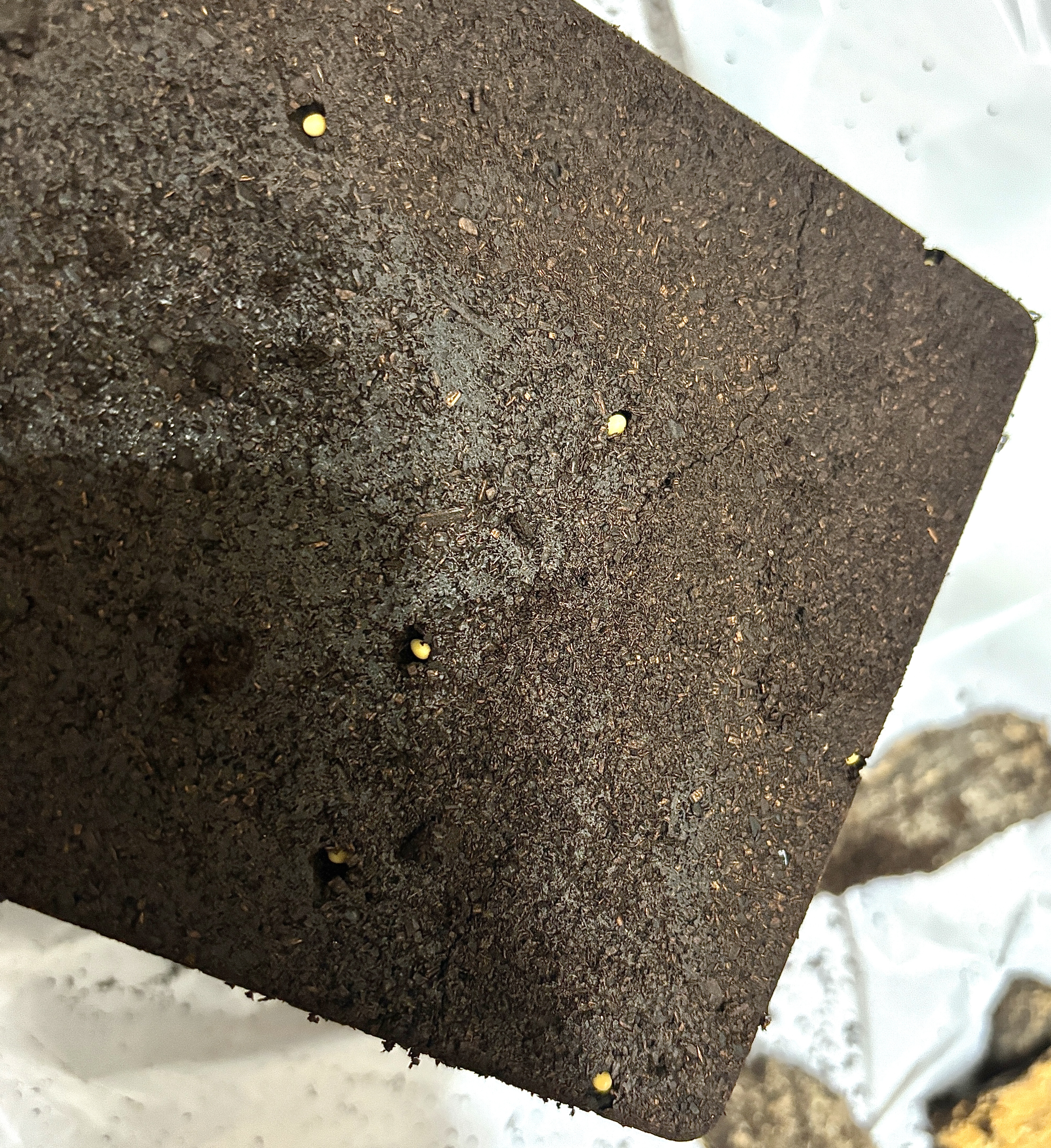コバエシャッター小に数日ガス抜きした完熟マットを水分が滲まない程度に加水し2層固詰め。表層を無加水で薄く敷いて軽くトントンした3層構造。穿孔しやすいよう中心に錐で穴を掘った。