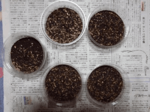 きのこマットは、フルイにかけて微粒子にしました。水分は、産卵木及びマット共に少し多めにしました。温度は比較的安定して温かった為、常温保管。なるべく衝撃などを与えないように、そっとしておきました。