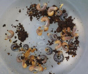 産卵木の中より、産卵木の下に幼虫が密集していた。