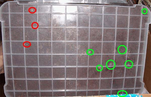 「くわMat」と「きのこMat」を半々に詰め、「どちらに多く産むか?」という実験を行いました。今回の結果は、「きのこMat」の圧勝でした。<セット内容>30cm×20cmのケースに深さ15cmほどマットを詰め、中央に霊芝材を置きました。左半分は「くわMat」、右半分は「きのこMat」(写真1)。