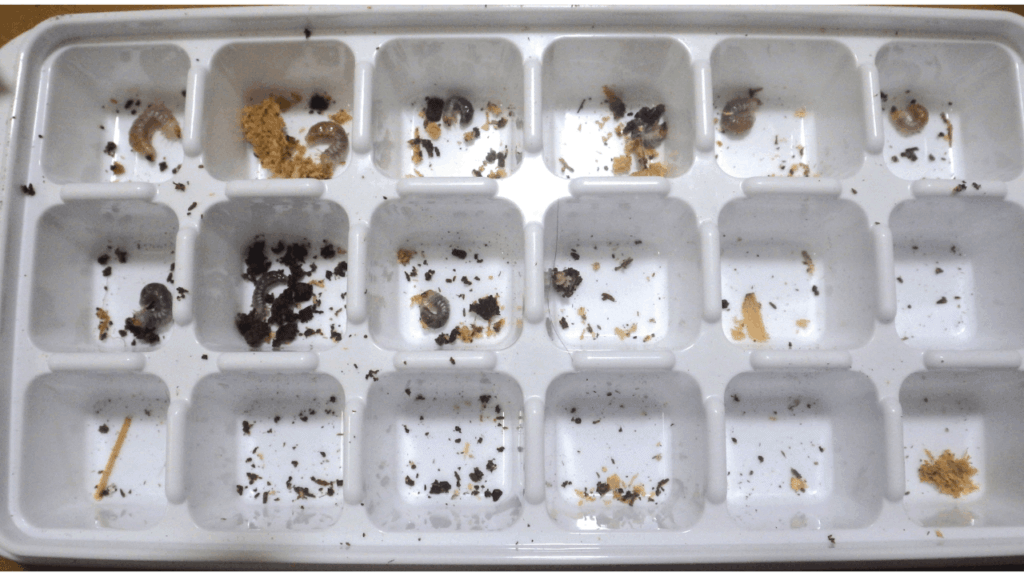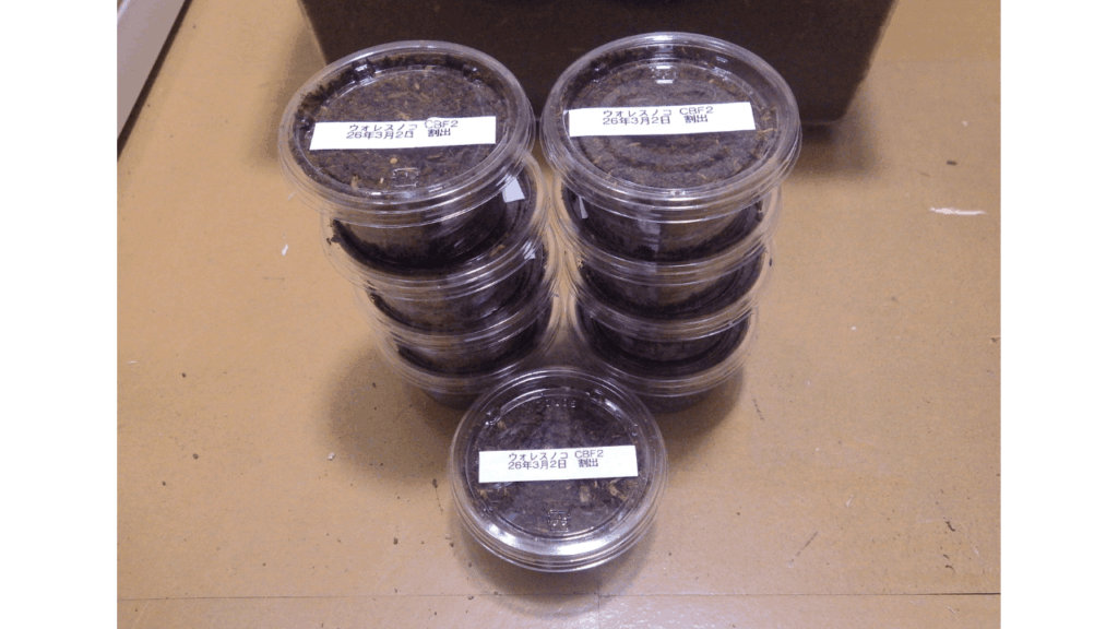 幼虫は材の中から5頭、マットから5頭回収しました(1頭事故で☆)。
