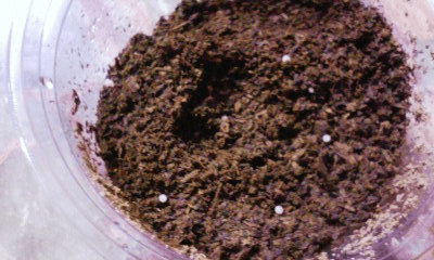 くわMat と完熟Matを3:1の割合で混ぜたものを小ケースに下5センチ固詰め、うえ5センチをふんわり詰めた。