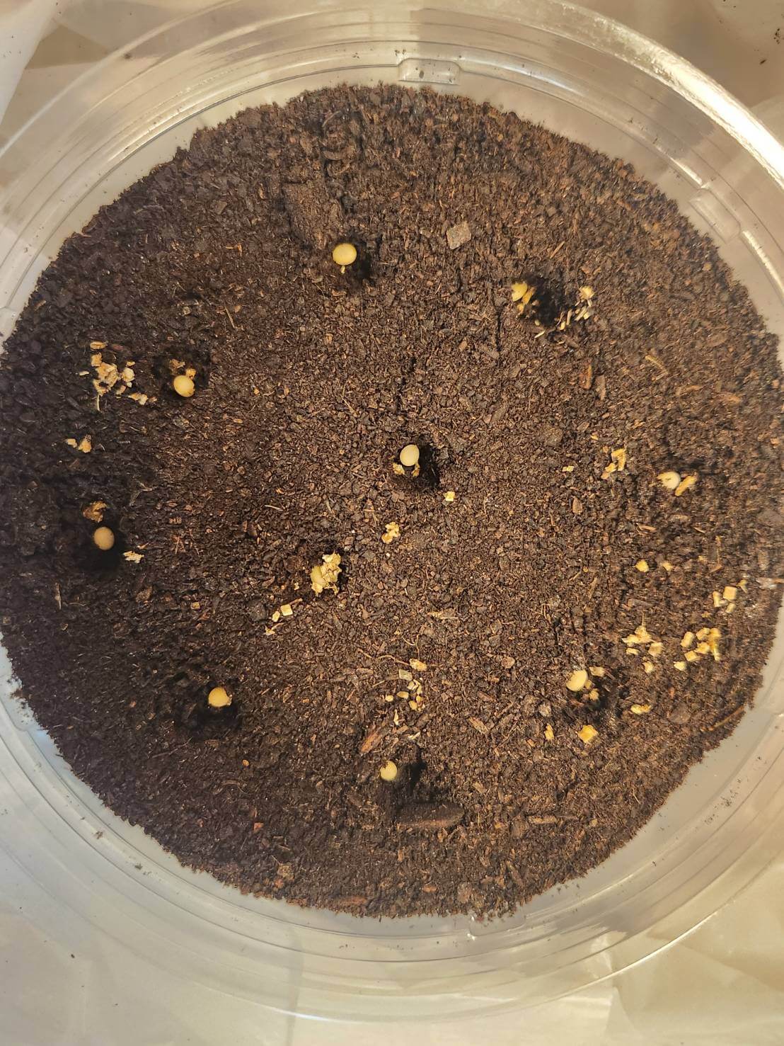 コバエシャッター小に、少し完熟マットを敷いて、その上にカワラ菌糸ビンN-1400を横に置いた。