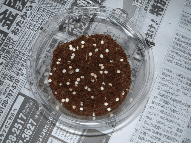 コバシャ中ケースを使用。下3~4cmは篩にかけた完熟マットをやや固詰め。大きな木片や小石を取り除いただけで、微粒子にはしていません。詰め方も握り拳で押し固めただけです。残りは完熟マットをそのまま10cmぐらい適当にドサっと入れただけです。