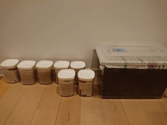 7匹は個別に菌糸ビンに入れ、残りは飼育スペース等の都合で多頭飼育です