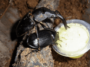 中プラケースにきのこマットを2/3程、固詰めし2~3cmほど、ふわっときのこマットをのせました。1ヶ月半ほどしたら側面の卵が孵化した為、メスを取り出しさらに数週間ほど保管してから割り出しました。産卵木なしだったので、割り出しは簡単でした。