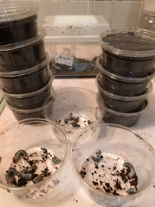 昨年は10頭の幼虫だったので、そのくらいかと高をくくっていたら、幼虫27頭と卵9こも産んでくれた。卵もあったので、ギリギリまで産んでいたよう。親はまだ元気。もう一回産卵床を組むか、思案中。