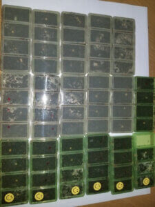 完熟マットをケース底面に固くつめ、ナラ材を1本入れ、その回りも固く詰める。上部2~3cmほどは柔らかくマットを入れる。少し材の頭が出るようにセット。