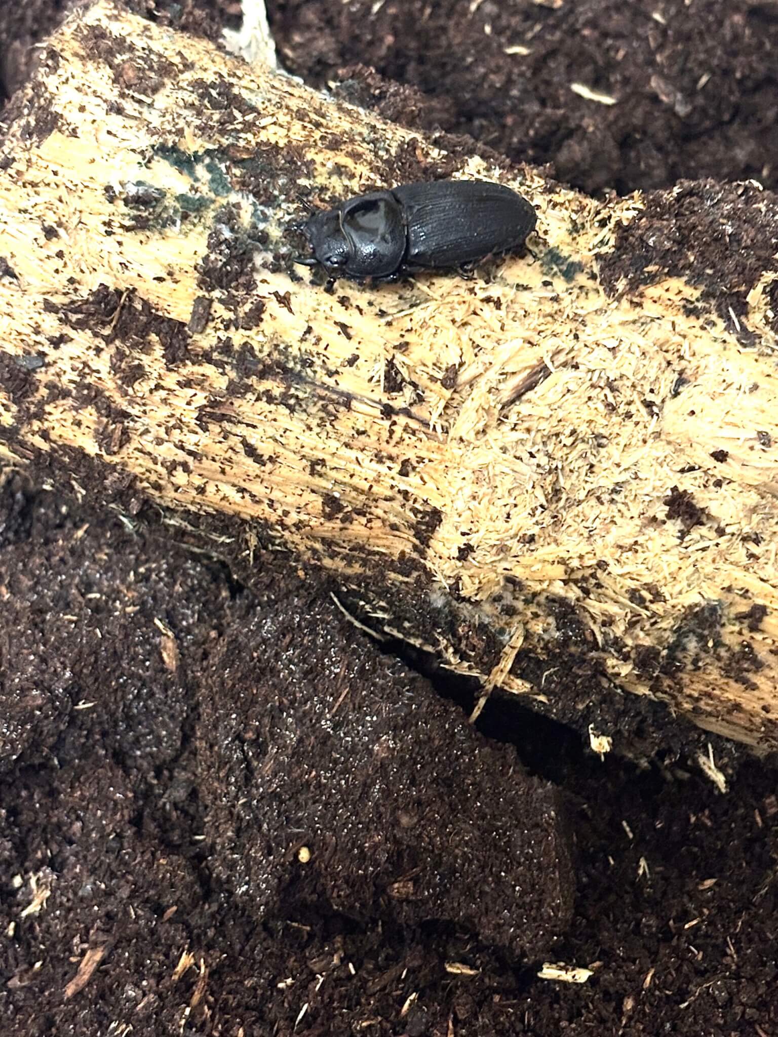 もう一世代続けるか迷っていたので2か月程同居飼育のままにしていましたが幸い♀殺しは起きませんでした。去年羽化で組む前には既に弱ってきており、材を齧ったり出来るのか不安でしたがとてもハイペースで材がボロボロにされており、側面卵も1つ見えていたので材の裏を見ると♀がおらず潜っていました。