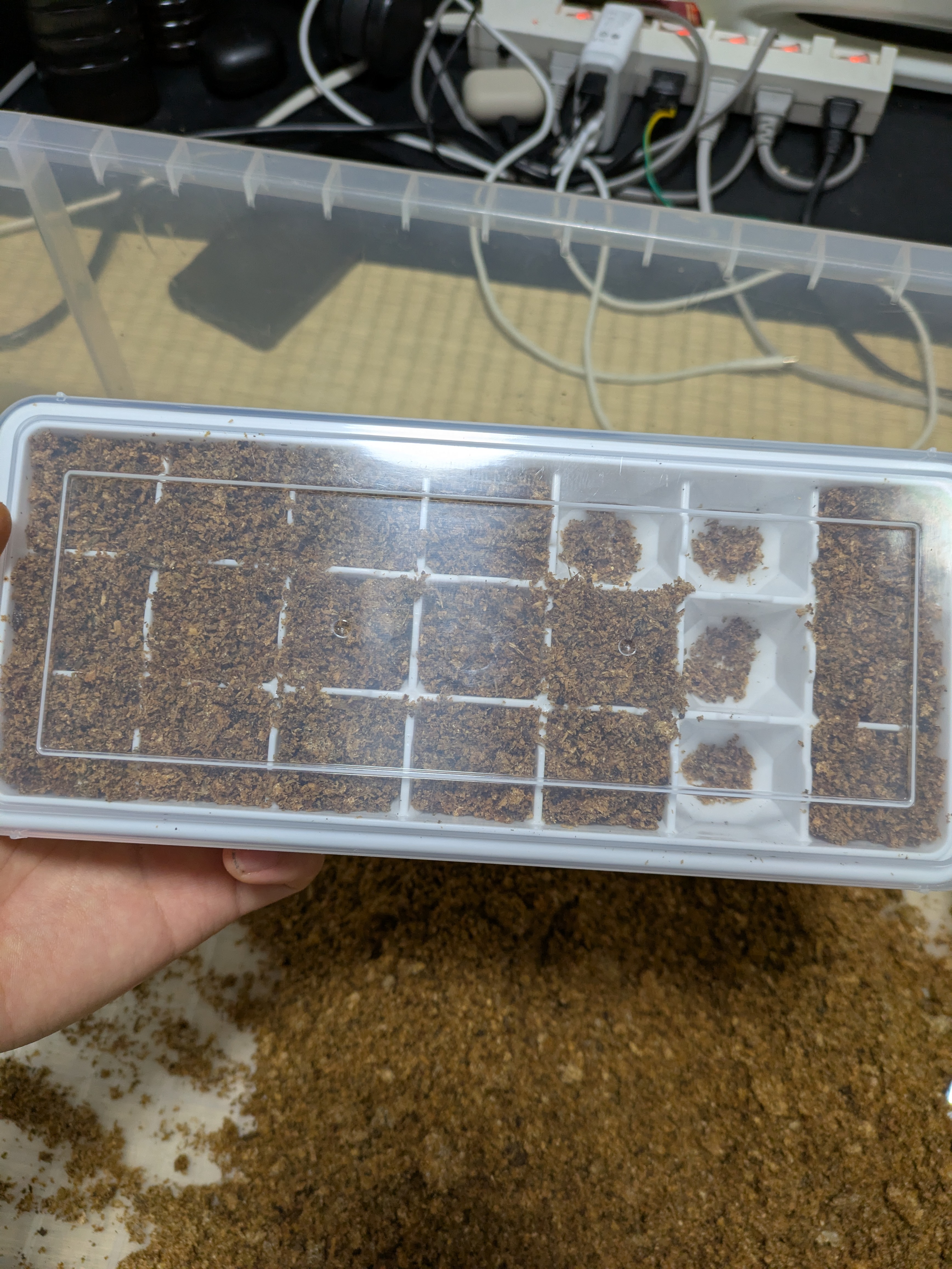 カビようが湿度が大事との考えの元、餌交換と一緒に霧吹きを行いました。蓋に結露が出来る程度を維持しました。青カビ等が広がる事はありませんでした。