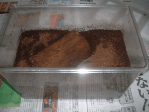 きのこmatを底に15cmほど詰めて産卵木を置いて上からふんわりときのこmatをかけました。オスと一緒に入れました。