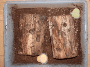 プラケース小。①底3センチ、ふるいを通したきのこマットを固詰め。②その上に、別のクワの割り出しの際に得られた柔らかい木片を置き(写真参照)、③さらにその上5cm、ふるいを通したきのこマットを固詰め。