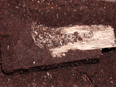 木片は、産卵促進に効果があったと考えられます。なぜならば、・木片は良く囓られていた(写真参照)・幼虫はその付近に密集していた・木片に産卵痕も見られた・プラケース側面や底面への産卵はなかったからです。また、マット内に坑道はなく、メスは木片付近にずっといたものと思われ、体力温存という効果もあったかも知れません。(割り出し時も、木片を囓っていました。)