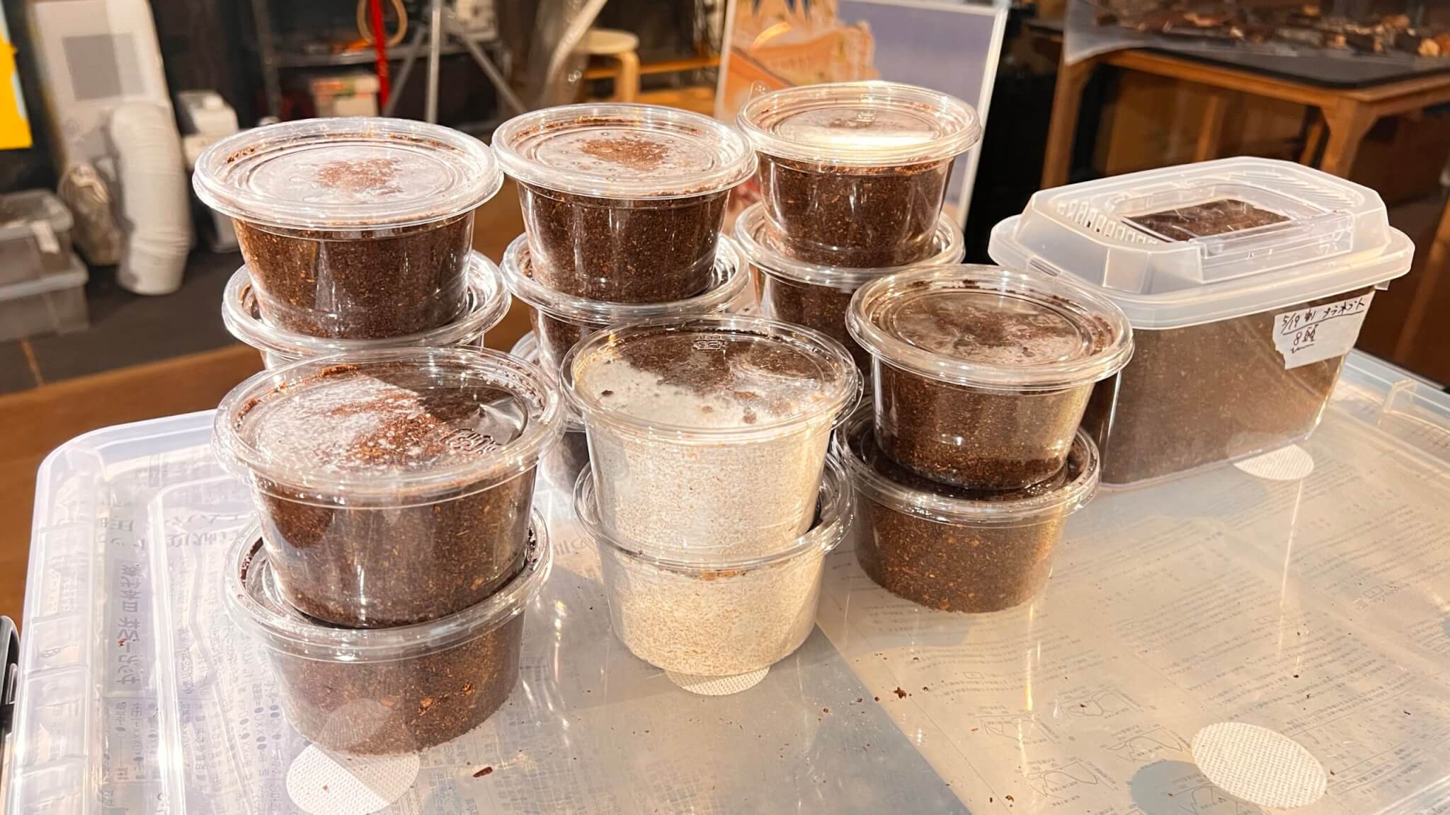 1頭だけ初令であとは全て2令です。それぞれ200プリンカップにきのこマットを詰めて13頭。小さめケースに8頭を多頭飼育。カワラ菌糸のプリンカップが2つ余っていたので、実験として2頭入れてみました。