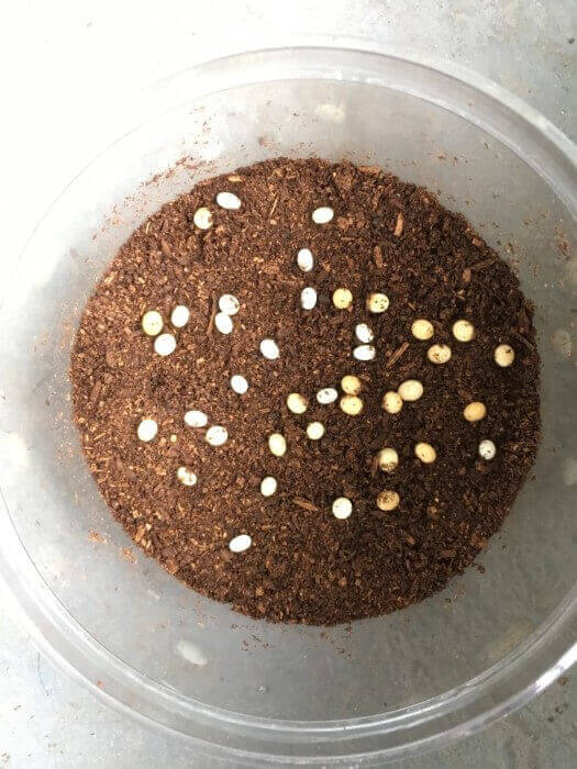 コバエシャッター大ほどの大きさのコンテナに底から6〜7割ほど固詰め。その上に軽くマットをのせその上にゼリー、足場となる木の皮を置いた。