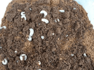 きのこMatを敷き詰め産卵木を入れました。産卵木に幼虫6、卵8でした。