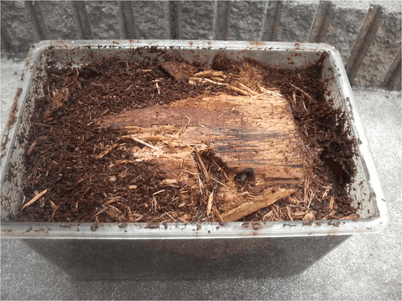 産卵木は月夜野さんから購入。皮をはぐ前は径12mm程度。肉質はやわらかく、太さも十分。一晩加水して、24時間の陰干し後、スクレイパーで皮をはいで小ケースへセット。きのこマットは1週間、ガス抜き(というか、衣装ケースに移してふたを開けて、物置に置きっぱなし)。適度な加水後、2cm程度、かたく詰めて産卵木を置いてまわりもかたく詰める。産卵木が少し出るくらいまできのこマットで埋めました。写真は、♀取り出し、直後。1か月、セット後、1か月で割り出し。