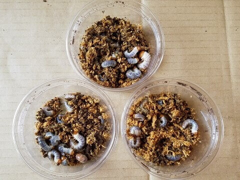 大ケースに、大きめの産卵木が半分くらい埋もるように、きのこマットを10cmくらい固詰めにして、Basicプロテインゼリーを1個置いて、暗い場所に放置した。