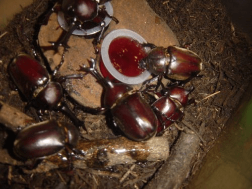 エサ切れには注意しました。オス1匹で65gのゼリーを一日で食べつくすので、時にはバナナ1本を丸ごとやりました。毎日エサ交換とコバエの撃退が必要でした。現在は、衣装ケース5個で3令になった幼虫を腐葉土で育てています。クワガタで不要になった菌糸のカスや使用済みマットのゴミ箱にもなってます。
