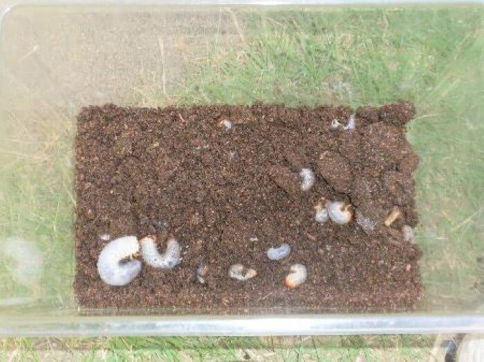きのこマットと市販の腐葉土を混ぜ、特大のケースの底に固めに