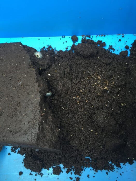 クリーンケース中サイズ使用。黒土マットを底面3センチ超硬詰めし、ケースの6割程の深さまでは少し押し固めて上部はフンワリと。やや多めに加水。写真のマットに白い粒が見えるのは念のためダニピタを混ぜておいたため。