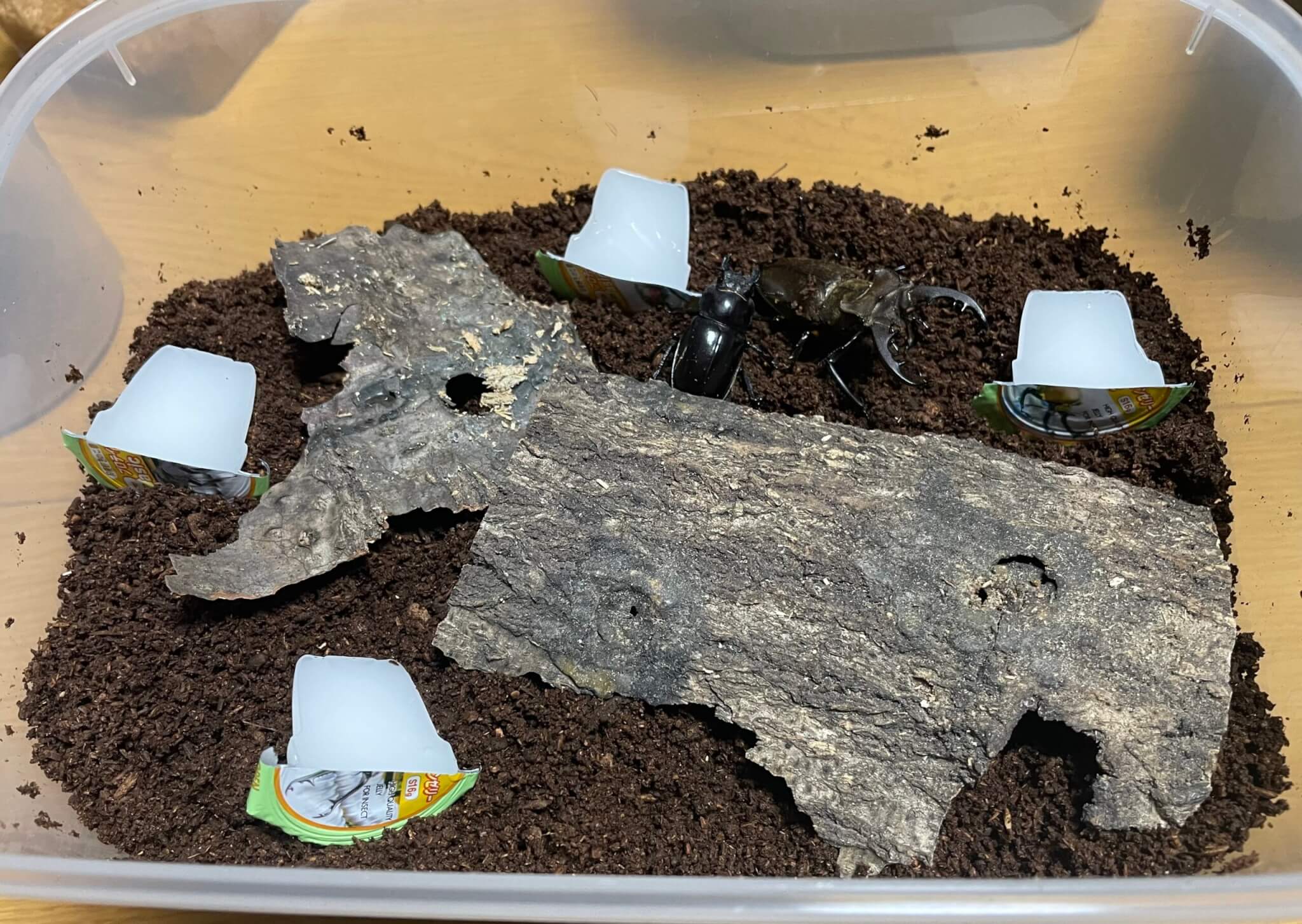 コバシャ小相当のケースで同居セット。下層は2〜3cm固詰め、中層は少し固める程度、上層はふんわり被せて転倒防止に産卵木の皮をおきました。