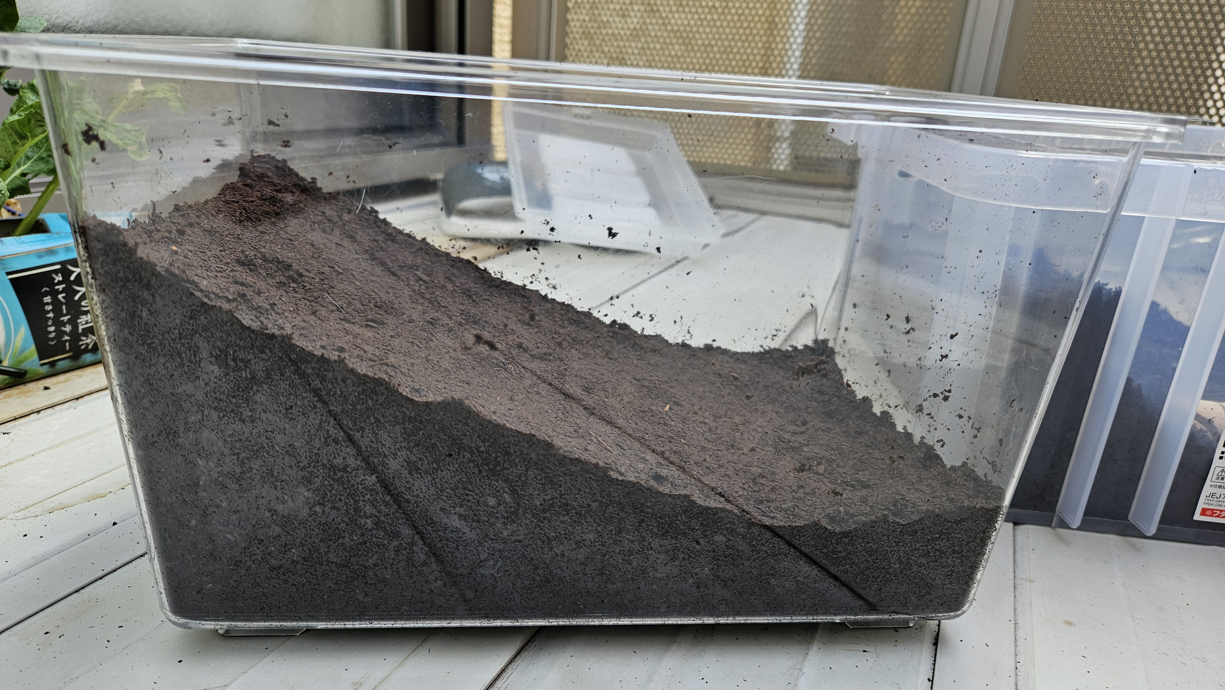 YouTubeの動画を参考にした方法であったが、孵化した幼虫は硬く詰めたマットの方に移動しており、卵は柔らかい部分にも産んでいたので、効果的であったと思う。