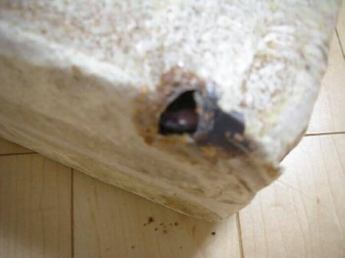 いつの間にか勝手に袋を破り菌糸ブロックにもぐりこんでいました。