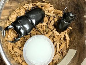 ケースはコバシャ小を使用。ホームセンターのクヌギ粉砕マットに産卵木を4/5埋め込みでセット。