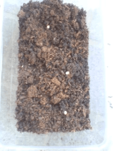 ケースに「きのこMat」を敷き産卵木を入れました。産卵木に生んでいました。